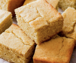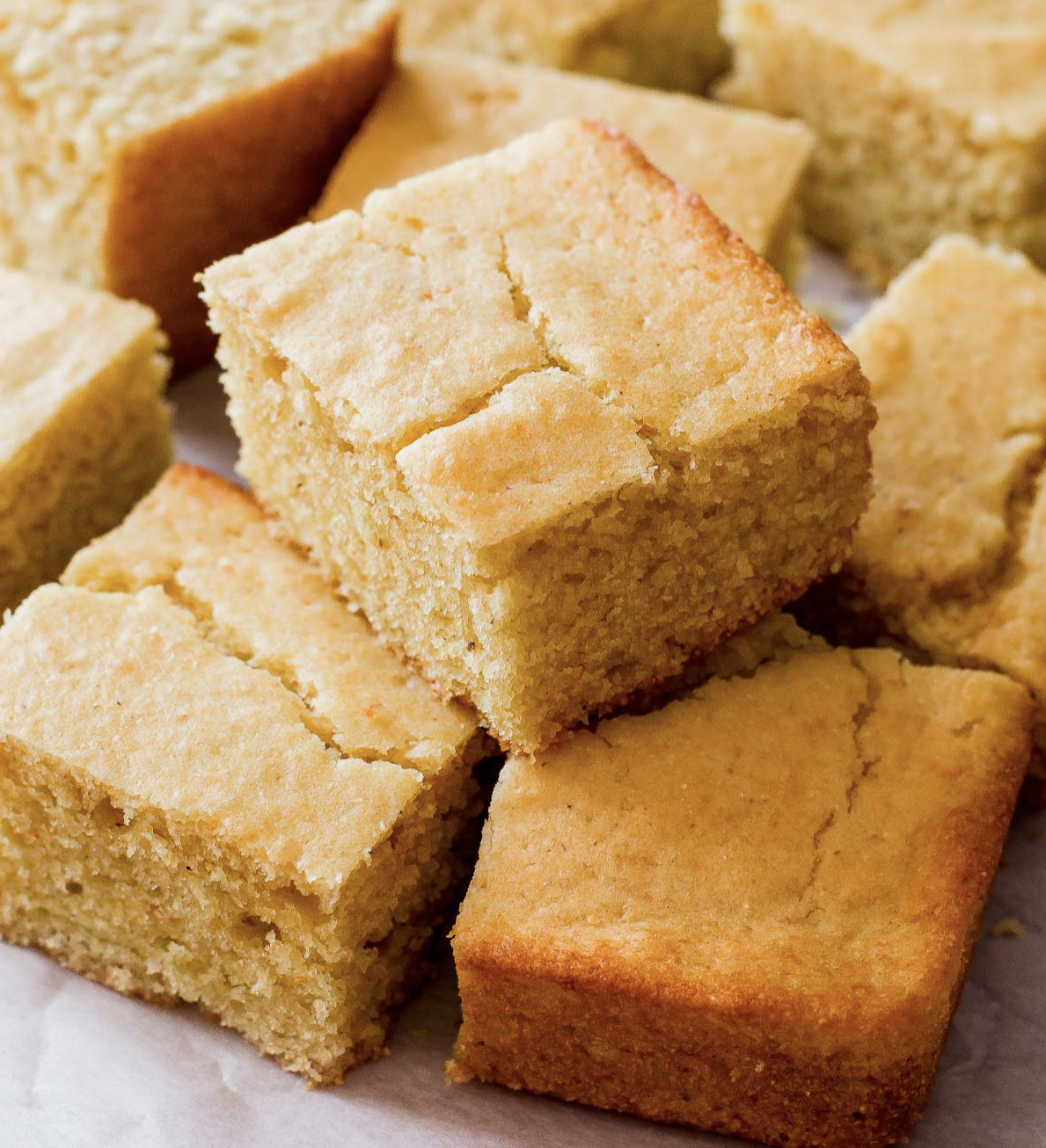 - Pour batter into the prepared pan, set on the middle rack of the oven, and bake for 25 minutes. Cornbread is done when edges are lightly browned and a knife inserted in the center comes out clean. Cut into 3 inch squares to serve.