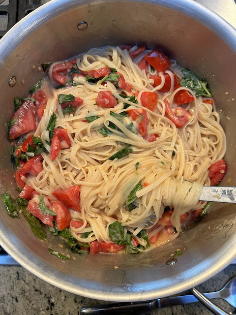 3. Drain pasta and immediately toss with the tomato sauce. Serve at once, passing the pepper mill, and grated Parmesan cheese if you like.