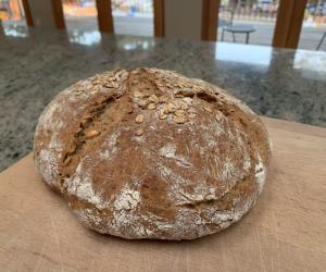 I got this receipt from Giggi Burns. Dense and chewy, great with soup. Can be made with a bread maker or overnight - see notes.