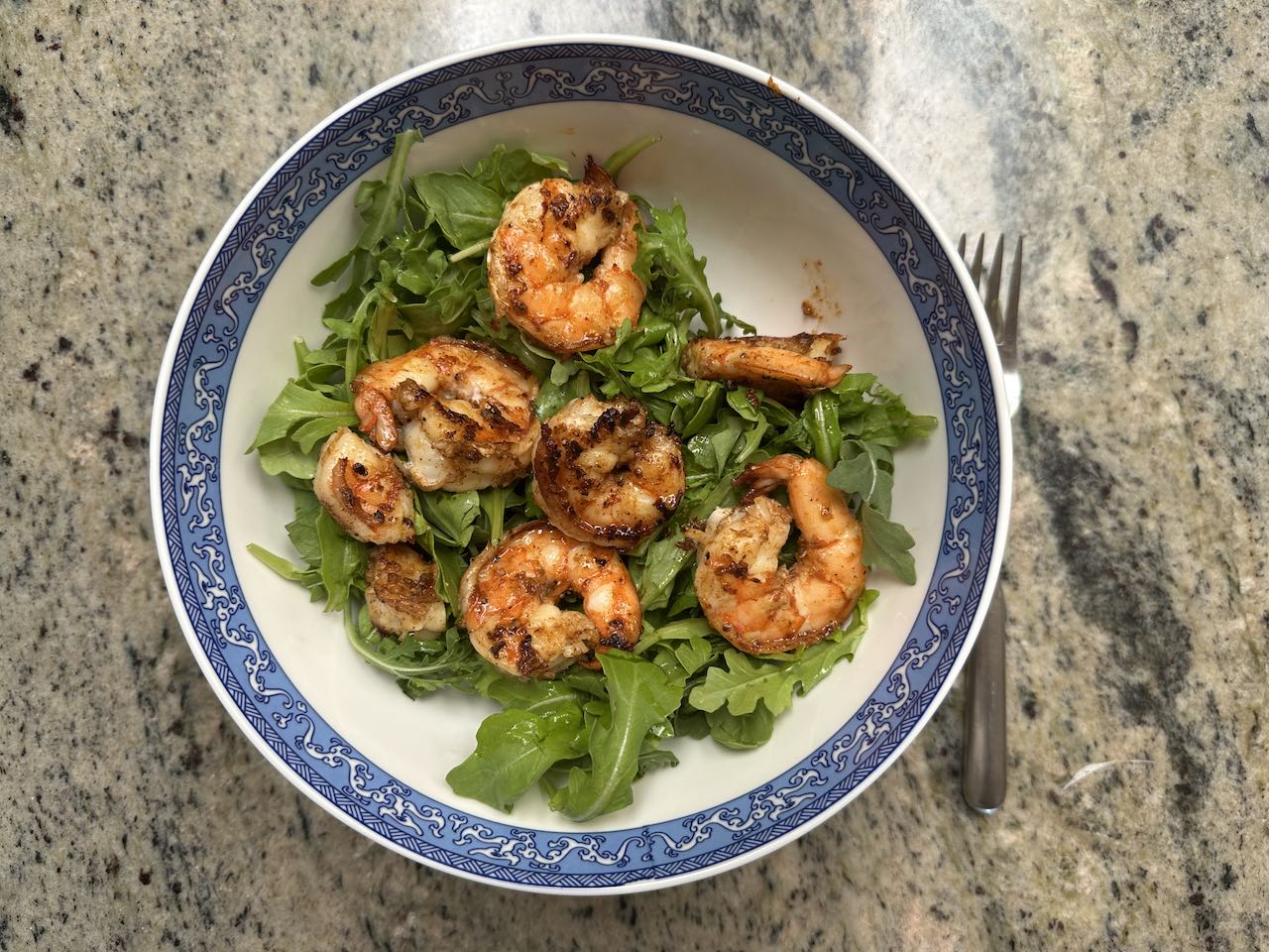 The shrimp are done when opaque, usually 3 to 4 minutes. Use a slotted spoon to transfer them to a plate; it is fine if they cool for a moment. Add shrimp juices to olive oil-lemon juice mixture, and stir. Dress the greens with this mixture, and toss; if the greens seem dry, add a little more olive oil or lemon juice, or both. Placegreens on a platter, and arrange shrimp on top or around them; garnish shrimp with the remaining minced mint.