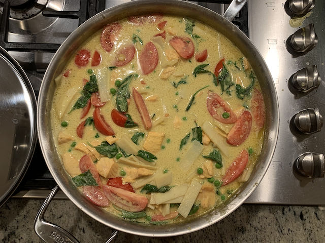 - Add the chicken and cook until it turns white. 3-5 minutes. Reduce heat to low. Add the remaining coconut milk, bamboo shoots, peas, and tomatoes. Continue to simmer until vegetable are thoroughly hot. About 3 minutes.